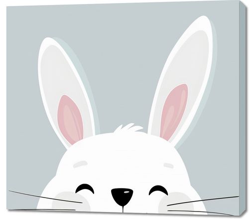 Obraz z serii wnętrza zatytułowany Radosne Skoki i przedstawia uroczy, radosny obraz króliczka, którego twarz wygląda spod górnego krawędzia obrazu. Jego wielkie, miękkie uszy w delikatnych odcieniach różu rzucają się w oczy na tle spokojnej, pastelowej szarości. Uśmiechające się zwierzątko, ze szczęśliwymi, zamkniętymi oczami, przywołuje atmosferę spokoju i radości. Idealny do pokojów dziecięcych lub jako przytulny akcent w kawiarniach i sklepach z artykułami dla dzieci. Jego subtelny, ale pełen ciepła charakter może również wprowadzić odrobinę uroku do każdej przestrzeni, która potrzebuje kropli niewinności i spokoju.