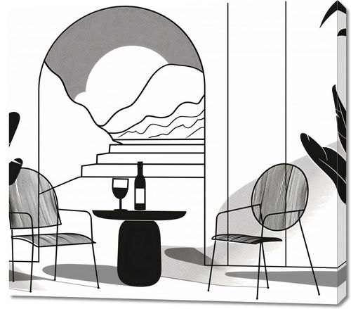 Obraz z serii minimalistyczne zatytułowany Relaks w Monochromie. Obraz przedstawia stylizowaną, monochromatyczną scenerię wnętrza wypoczynkowego, w którym dominuje spokój i prostota. Czarno-białe rośliny dodają życia eleganckiemu, geometrycznemu przestrzeni, a finezyjnie zaprojektowane meble tworzą atmosferę luksusu i komfortu. Na pierwszym planie widoczny jest okrągły stolik z butelką wina i dwoma kieliszkami, sugerujący chwilę relaksu lub intymnego spotkania. Tło stanowi wielki, abstrakcyjny obraz, który może przypominać ułożone w rzędy fale morskie lub schody prowadzące ku nieznanemu. Obraz ten jest doskonały do nowoczesnych mieszkań i miejsc użyteczności publicznej, gdzie dominuje współczesny design i minimalistyczne podejście do dekoracji. Jego prostota i elegancja doskonale odnajdą się w przestronnych salonach, stylowych lobby hotelowych lub modnych przestrzeniach lounge.