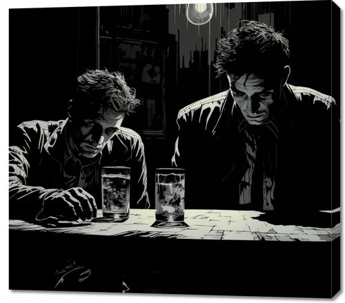 Obraz z serii abstrakcja zatytułowany Spiskowcy. Ta grafika przedstawia dwóch mężczyzn zanurzonych w głębokiej konwersacji przy barowym stole. Stylizacja na czarno-biało uchwyciła napięte, dramatyczne oświetlenie i cienie, które nadają scenie klimat tajemniczości i suspensu. Wyraźne kontury i kontrastowe światłocienie podkreślają wyraziste postaci mężczyzn i ich zacięte postawy. Obraz ten przemawia do miłośników klasycznego kina i literatury, doskonale nadając się do dekoracji przestrzeni o męskim charakterze, takich jak prywatne gabinety, domowe bary czy miejsca spotkań.