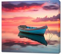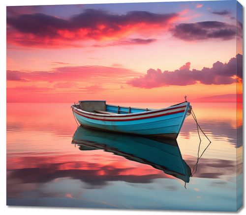 Obraz z serii pejzaże zatytułowany Spokój przed Połowem. Ta malownicza scena przedstawia samotną łódź na tafli wody, z tłem zachodzącego słońca, które barwi niebo i powierzchnię wody w odcienie czerwieni i pomarańczy. Odbicie łodzi w wodzie tworzy symetrię, która wprowadza w stan medytacji i spokoju. Obraz doskonale nadaje się do pomieszczeń, gdzie chcemy wprowadzić elementy natury i harmonii, takich jak salony, gabinety czy przestrzenie wellness.