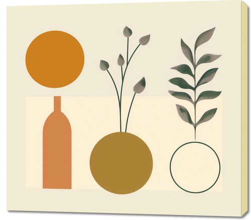 Obraz z serii boho zatytułowany Symfonia Równowagi. Obraz łączy organiczne kształty roślin z rygorystyczną formą geometrii. Prezentuje on wazony w spokojnych odcieniach brązu i złota, z których jeden jest ozdobiony gałązkami z delikatnymi pąkami, a drugi pokazuje symetryczny wzór liści. Proste linie i figury geometryczne, takie jak okrąg i prostokąt, tworzą tło dla roślinności, przypominając o ludzkiej próbie ujarzmienia natury. Całość osadzona na pastelowym tle wywołuje uczucie spokoju i harmonii. To dzieło będzie pasowało do przestrzeni, które cenią równowagę między naturą a stworzonym przez człowieka porządkiem, jak eleganckie gabinety, przestrzenie wellness lub strefy odpoczynku, które dążą do stworzenia oazy spokoju w zabieganym świecie.