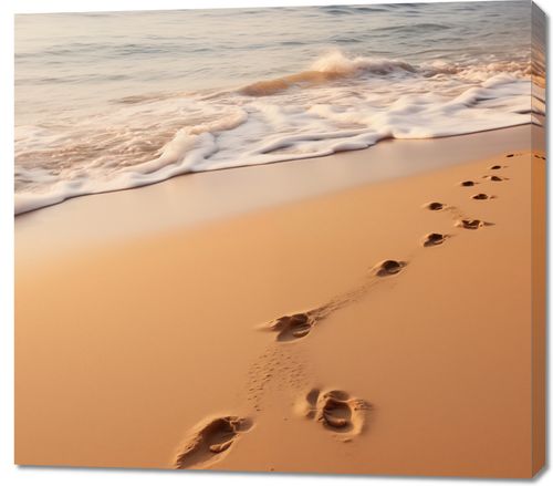 Obraz z serii pejzaże zatytułowany Szepty Fal przedstawia obraz, który zaprasza widza do kontemplacji i refleksji. Delikatne ślady stóp wskazują na cichą obecność, a przytłumione szumy fal i miękki piasek podkreślają uczucie spokoju. Rozmyte kolory zachodu słońca, które malują niebo na niemal nierzeczywiste odcienie pomarańczy i błękitu, wydają się być synonimem spokojnego zakończenia dnia. Ta praca idealnie wkomponuje się w estetykę współczesnych salonów lub pokoi wypoczynkowych, które cenią sobie minimalizm i naturę, a także będzie znakomitym wyborem dla przestrzeni wellness i spa, gdzie harmonia i spokój są kluczowymi elementami.