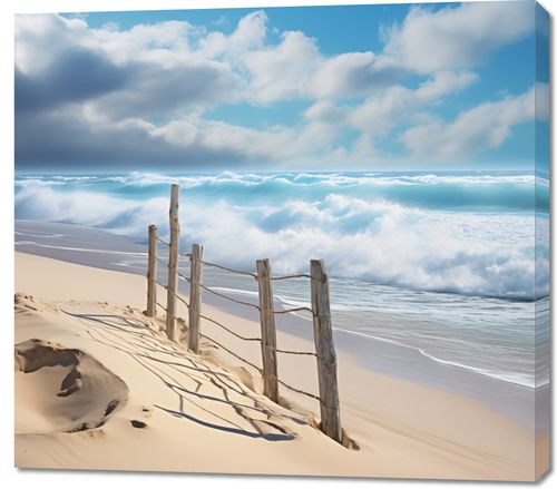 Obraz z serii pejzaże zatytułowany Szepty Oceanu przedstawia dziką, nieokiełznaną siłę natury, uchwyconą w potężnych, spienionych falach oceanu bijących o brzeg. Stare, drewniane słupki, połączone powykręcanym sznurem, dodają kompozycji surowego charakteru i poczucia trwałości w obliczu nieskończonej przestrzeni wody. Piasek, modelowany przez wiatr, tworzy delikatne wzory, które kontrastują z mocy i wielkości oceanu. Ten obraz jest kwintesencją siły i spokoju, idealny do przestrzeni współczesnych, minimalistycznych lub tych o morskim motywie, gdzie może inspirować do refleksji nad nieustającą zmiennością i majestatem natury.