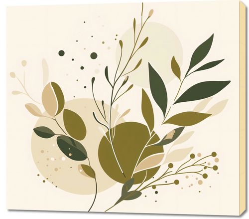 Obraz z serii minimalistyczne zatytułowany Szronowata Barwa. Przedstawia on delikatną kompozycję liści i gałązek w tonacjach zieleni i beżu, na łagodnym tle w pastelowych barwach, z dyskretnymi kropeczkami przypominającymi spokojny deszcz dodając elementu kontemplacji. Ten obraz wprowadzi harmonię i delikatność do każdego pomieszczenia. Jego stonowane kolory i prosta forma doskonale odnajdą się w przestronnych i jasnych wnętrzach, takich jak skandynawskie mieszkania, biura, czy salony spa.