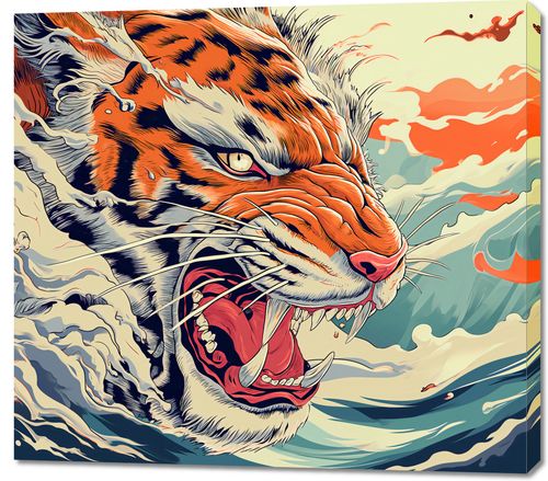 Obraz z serii motywy wschodnie zatytułowany Tygrys Na Fali. Ilustracja przedstawia potężnego tygrysa wyłaniającego się z wzburzonych fal oceanu, z paszczą szeroko otwartą w głośnym ryku. Styl graficzny, z wyrazistymi liniami i żywymi kolorami, przypomina klasyczne azjatyckie sztuki, łącząc w sobie elementy tradycji i nowoczesności. Dynamiczne pociągnięcia pędzlem i kontrastowe kolory podkreślają siłę i dzikość sceny. Obraz ten będzie idealnym akcentem w przestrzeniach, które celebrują energię i życiową siłę, takich jak sale do ćwiczeń, studia artystyczne czy nowoczesne biura.