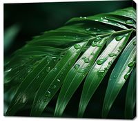 Obraz z serii natura zatytułowany Żywa Łagodność, przedstawia szczegółowe zbliżenie na liście palmy w odcieniach żywej zieleni, oświetlone promieniami słońca przenikającymi przez ich szpary. Gładkie i lśniące liście, z delikatnymi kroplami wody na ich powierzchni, tworzą poczucie ruchu i dynamiki, podczas gdy ich kontrastujące linie i formy wnoszą element struktury i elegancji. Delikatne światło i cienie na liściach, w połączeniu z bogatą paletą zieleni, wywołują uczucie spokoju oraz bliskości z naturą. Ta fotograficzna kompozycja mogłaby doskonale uzupełnić wnętrza, które cenią naturalność i organiczną estetykę, takie jak eko-salon, przestrzeń do jogi lub biura koncentrujące się na zrównoważonym rozwoju i ekologicznych inicjatywach.