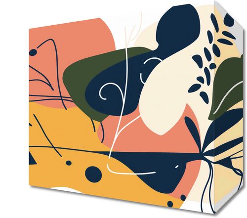 Obraz z serii minimalistyczne zatytułowany Dynamika Wizji. Grafika prezentuje żywą kompozycję abstrakcyjnych kształtów i linii, które tworzą energiczny, ale harmonijny obraz. Kolorystyka oscyluje wokół ciepłych tonów pomarańczu, żółci i bieli, z akcentami głębokiej zieleni, co nadaje pracy witalność i świeżość. Idealnie sprawdzi się jako ożywczy element w przestrzeniach minimalistycznych, takich jak nowoczesne biura, kreatywne studia, czy też domowe atelier. Może stanowić też centralny punkt w pomieszczeniach o stonowanej kolorystyce, przynosząc energię i ciepło do wnętrza. Wprowadzi dynamizm do każdej przestrzeni, zachowując przy tym poczucie elegancji i współczesnego designu.
