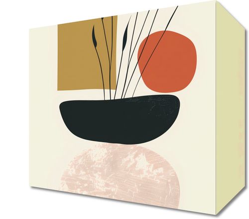 Obraz z serii boho zatytułowany Formy Natury to dzieło sztuki wykorzystujące geometryczne kształty i stonowaną paletę kolorów do stworzenia spokojnego, lecz intrygującego obrazu. Centralnym elementem kompozycji jest czarna, półokrągła forma, która może przypominać naczynie, z której wyrastają delikatne źdźbła traw. Kształty w kolorze terakoty i beżu dodają ciepła i są tłem dla tej roślinnej formy. Obraz ma subtelną teksturę, przypominającą płótno, co nadaje mu wrażenia głębi i faktury. Idealnie nadaje się do wnętrz w stylu skandynawskim, minimalizmu, a także jako łagodne uzupełnienie nowoczesnego biura czy sypialni.