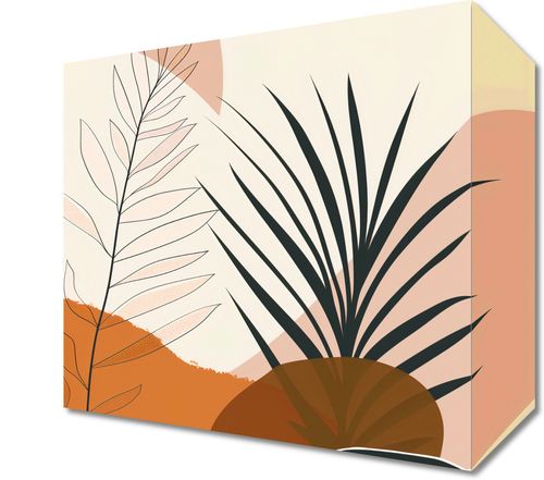 Obraz z serii minimalistyczne zatytułowany Harmonia Zen.Przedstawia eleganckie, abstrakcyjne formy roślin i geometryczne figury w ciepłych, pastelowych barwach zachodzącego słońca. Centralnym elementem jest stylowy czarny kubek z dekoracyjnym wzorem, który nadaje kompozycji głębi. Obraz ten będzie idealnym dodatkiem do spokojnych i stylowych wnętrz, jak sypialnie, pokoje relaksacyjne czy nowoczesne przestrzenie biurowe, wprowadzając atmosferę wyciszenia i estetycznego porządku.