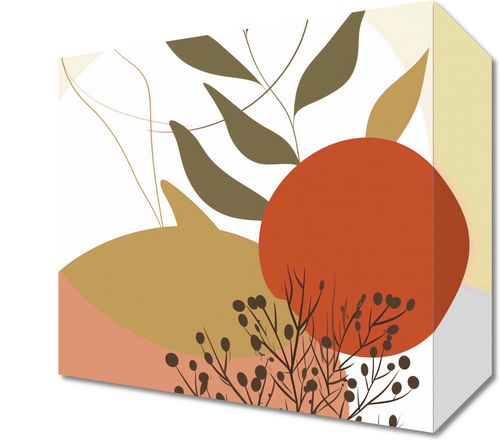 Obraz z serii minimalistyczne zatytułowany Impresja Jesieni.Grafika ta jest dynamiczna i wyważona, z pogłębioną paletą kolorów nawiązującą do jesiennego sezonu. Użyte odcienie czerwieni, pomarańczy i beżu, wsparte głęboką zielenią, wprowadzają uczucie ciepła i spokoju. Delikatne linie i formy przypominają o płynącym czasie i zmienności natury. Obraz ten mógłby być doskonałym akcentem w pomieszczeniach o neutralnym wystroju, wprowadzając element sezonowej zmiany i podkreślając naturalną elegancję przestrzeni.