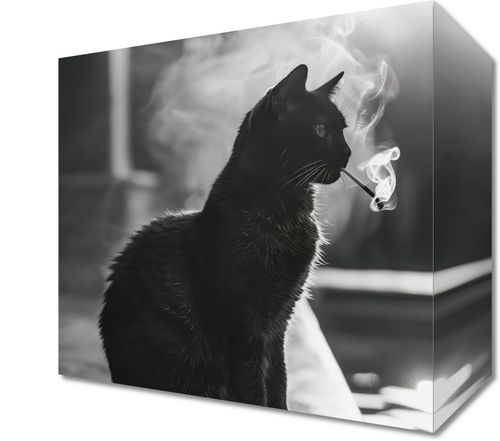 Obraz z serii wnętrza zatytułowany Kocia Przerwa. Na tym obrazie uwieczniono czarnego kota siedzącego na krawędzi, zanurzonego w promieniach rozproszonego światła, które podkreślają jego błyszczącą sierść i wyraziste kontury. Kocie wąsy delikatnie zarysowane w kontraście ze światłem nadają mu wyrazistości, a unoszący się dym tworzy aurę tajemniczości. Jest to obraz zarówno elegancki, jak i zagadkowy, idealny dla miłośników zwierząt i minimalistycznego designu. Obraz ten będzie pasował do każdego wnętrza, od klasycznego po nowoczesne, dodając subtelnego charakteru i spokoju.