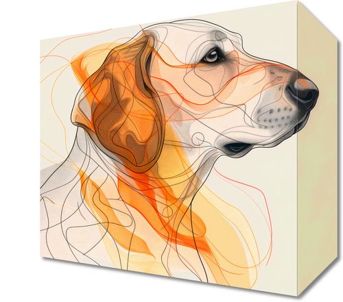 Obraz z serii abstrakcja zatytułowany Kontur Profilowego. Obraz przedstawia portret psa w stylu artystycznym, z subtelnie zaznaczonymi, ale wyraźnymi cechami. Kompozycja łączy realistyczne detale takie jak oczy, nos i uszy z abstrakcyjnymi, płynnymi liniami i plamami kolorów, które tworzą wrażenie ruchu i głębi. Dominujące kolory to odcienie pomarańczowego, żółtego i brązu, które idealnie oddają ciepło i przyjazny charakter zwierzęcia. Tło w neutralnym, pastelowym odcieniu podkreśla i równoważy bardziej dynamiczne elementy grafiki. Obraz emanuje spokojem i może wzbudzać pozytywne emocje, będąc jednocześnie wyrafinowanym, artystycznym przedstawieniem psa, który może być ulubieńcem rodziny lub po prostu przykuwającym uwagę elementem dekoracyjnym.