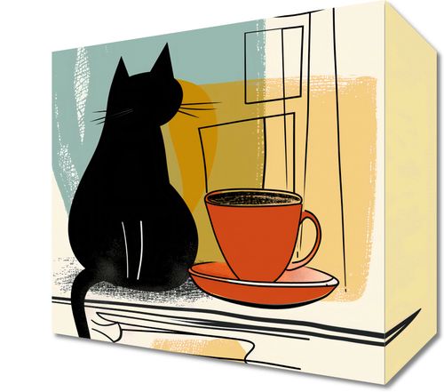Obraz z serii abstrakcja zatytułowany Kot i Kawa. Ten pełen uroku obraz przedstawia sylwetkę czarnego kota, który wydaje się kontemplować filiżankę kawy. Stylizacja grafiki, z jej czystymi liniami i blokami kolorów w ciepłych odcieniach beżu, ochry oraz stonowanej zieleni i błękitu, tworzy atmosferę spokojnego poranka. Abstrakcyjne elementy w tle, przypominające sztukę modernistyczną, nadają plakatowi współczesnego charakteru. To dzieło sztuki idealnie pasuje do kawiarni, kuchni, a także jako subtelny akcent w nowoczesnym salonie, oferując wizualne wyrażenie komfortu i relaksu.