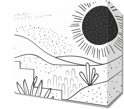 Obraz z serii minimalistyczne zatytułowany Linearny Pejzaż. Obraz przedstawia liniową ilustrację krajobrazu w czerni i bieli, gdzie przestrzeń zapełniają delikatne linie, kropki i abstrakcyjne formy roślinności. Centralnym punktem jest stylizowane słońce z promieniami rozchodzącymi się we wszystkie strony, towarzyszy mu mniejsze ciało niebieskie, które może symbolizować planetę lub księżyc. Lekkie kropki sugerują obecność piasku lub gwiazd, dodając elementu fantazji. Ten obraz wprowadzi do każdej przestrzeni element spokoju i prostoty. Idealnie nadaje się do nowoczesnych przestrzeni, takich jak minimalistyczne biura, jadalnie czy pokoje młodzieżowe, dostarczając neutralnej palety, która pasuje do wielu schematów kolorystycznych i stylów dekoracyjnych.