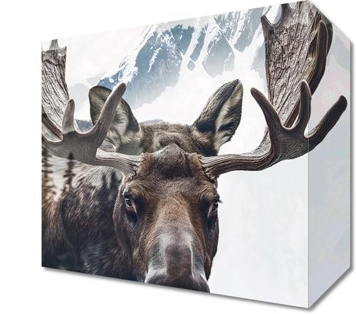 Obraz z serii natura zatytułowany Łoś Duch Lasu to majestatyczne przedstawienie łosia, którego potężne poroże przeobraża się w górski krajobraz. Na pierwszym planie widzimy głęboki, przenikliwy wzrok łosia, skupionego na widzu, z pięknymi, szczegółowo odwzorowanymi detalami sierści. Jego rozłożyste poroże płynnie przeistacza się w ośnieżone szczyty, co symbolizuje jego władzę i jedność z dziką przyrodą. Jasne, lekko zamglone tło sugeruje poranne światło, dodając plakatowi poczucia tajemnicy i dzikiego piękna. Ten obraz doskonale sprawdzi się w przestrzeniach inspirowanych naturą, takich jak chaty górskie, domy myśliwskie, lub jako wyraz głębokiego szacunku dla dzikiej przyrody w salonach i przestrzeniach wspólnych miłośników natury.
