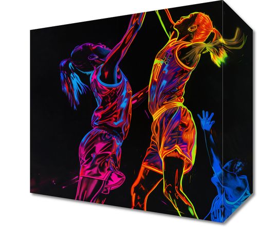 Obraz z serii abstrakcja zatytułowany Mecz W Kosza. Przedstawia żywą i dynamiczną scenę z gry w koszykówkę, w której dwie zawodniczki rywalizują o piłkę. Graczka w pierwszym planie wykonuje skok do kosza w akcie rzutu lub bloku, rozciągając się w pełnej koncentracji, podczas gdy jej przeciwniczka stara się ją zablokować. Figury sportowców są przedstawione w intensywnych, neonowych kolorach, które kontrastują z ciemnym tłem, co nadaje scenie energiczny i ekscytujący charakter. Kolory są rozmieszczone na postaciach w sposób, który podkreśla ich ruch i ekspresję, a także oddaje dynamikę i szybkość sportowej akcji. Obraz ten idealnie oddaje ducha sportowej rywalizacji i mogłby być inspirującym dodatkiem do wnętrza dla miłośników koszykówki i sportu.