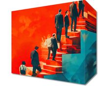 Obraz z serii abstrakcja zatytułowany Metafory Sukcesu. Przedstawia on różne postacie w formalnym ubiorze, wchodzące i schodzące po schodach, które rozdzielają się i zbiegają w różnych kierunkach. Tło obrazu jest podzielone na dwie kontrastujące strony - jedna w odcieniach czerwieni, a druga w chłodnych błękitach, symbolizując różne ścieżki i wybory w życiu zawodowym lub osobistym. Styl graficzny łączy elementy abstrakcyjne i figuralne, a silne kontrasty kolorystyczne podkreślają dynamikę i złożoność podejmowanych decyzji. Obraz ten mógłby być inspirującym dodatkiem do biura lub przestrzeni pracy, zachęcającym do refleksji nad własnym rozwojem i aspiracjami.