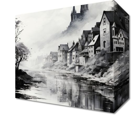 Obraz z serii pejzaże zatytułowany Mglisty Refleks. Misterne pociągnięcia pędzla przedstawiają starą wieś schowaną w mrocznych zakątkach gór, z dominującymi wieżami kościoła wznoszącymi się nad nią. Mgła otulająca krajobraz i odbicie w spokojnej wodzie tworzą atmosferę tajemniczości i zadumy. Monochromatyczna paleta barw dodaje głębi i intensywności całemu obrazowi, czyniąc go idealnym wyborem dla klasycznych salonów oraz miejsc takich jak kawiarnie o historycznym charakterze czy ekskluzywne kluby dyskusyjne.