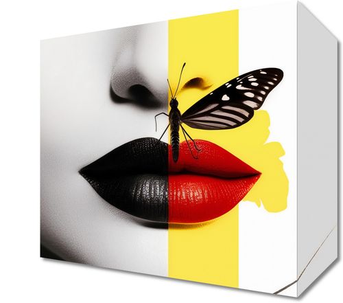 Obraz z serii abstrakcja zatytułowany Motyla Piękność. Ten obraz przedstawia twarz kobiety podzieloną na dwa kontrastujące segmenty: jeden w czerni i bieli, drugi w żywych kolorach z motylem na ustach. Ilustracja eksploruje temat dualizmu natury ludzkiej, piękna i jego zmienności. Obraz ten jest idealnym wyborem dla przestrzeni o współczesnym designie, takich jak salony piękności, studia artystyczne, a także jako wyrazisty element dekoracyjny w nowoczesnych domach.
