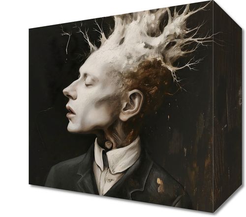 Obraz z serii abstrakcja zatytułowany Myśli Wzrastające prezentuje surrealistyczny portret mężczyzny, z którego głowy wyłania się skomplikowana struktura przypominająca korzenie lub gałęzie drzewa. Ten organiczny koronament wyrasta z myśli postaci, symbolizując rozwój, kreatywność i złożoność ludzkiego umysłu. Kontrast między żywą bielą i szarościami struktury a głębokim, ciemnym tłem sugeruje głębię i intensywność wewnętrznego świata postaci. Ten obraz może stanowić mocny wizualny akcent w przestrzeniach takich jak galerie, artystyczne pracownie, gabinety psychologiczne, a także we wnętrzach osób ceniących głębokie, filozoficzne refleksje.