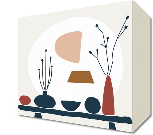 Obraz z serii boho zatytułowany Naturański Stół. Obraz to subtelna i uporządkowana prezentacja natury w stylizowanej, niemal scenicznej formie. Abstrakcyjne kształty w ciepłych i stonowanych kolorach przedstawiają wazony i rośliny na tle geometrycznych form przypominających wschód i zachód słońca. Kompozycja na neutralnym tle łączy sztukę z naturą w spójnym, współczesnym stylu. Dzieło to będzie idealnym uzupełnieniem wnętrz, w których ceniona jest prostota, ale jednocześnie szukających ciepła i naturalności. Może znaleźć miejsce w domowych salonach, jadalniach, lub jako urokliwy element w przestrzeniach biurowych, wniosąc odrobinę uroku i artystycznego nastroju.