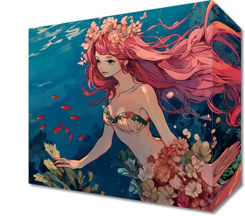 Obraz z serii wnętrza zatytułowany Nimfa Oceanu przedstawia eteryczną postać kobiecą zatopioną w głębinach morskich. Jej długie, różowe włosy płyną z prądem wody, mieszając się z otaczającymi ją kwiatami i roślinami morskimi. Czerwone ryby dodają akcentu kolorystycznego, tworząc wrażenie ruchu i życia pod wodą. Postać nimfy, z jej delikatną sylwetką i spokojnym wyrazem twarzy, stanowi centralny punkt kompozycji, sugerując spójność człowieka z naturą. Ten oniryczny obraz świetnie sprawdzi się jako element dekoracyjny w przestrzeniach relaksacyjnych takich jak spa, salony piękności, a także jako inspirująca dekoracja do pokoju osobistego lub medytacyjnego, zachęcając do refleksji i wyciszenia.