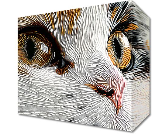 Obraz z serii abstrakcja zatytułowany Niktowany Kot. Ukazuje zbliżenie na twarz kota, wykonane z niezwykłą dbałością o detale, co sprawia wrażenie trójwymiarowości. Całość jest utrzymana w technice przypominającej szycie lub haft, gdzie każda nitka została precyzyjnie ułożona, aby naśladować naturalne linie futra. Olśniewające, złote oczy kota są pełne wyrazu i życia, przyciągają uwagę i są centralnym punktem kompozycji. Złożone z wielu warstw i kolorów linie tworzą dynamiczną i niemal hipnotyzującą teksturę. Obraz ten byłby doskonałym wyborem dla miłośników sztuki i zwierząt, wnosząc element elegancji i oryginalności do każdego wnętrza.