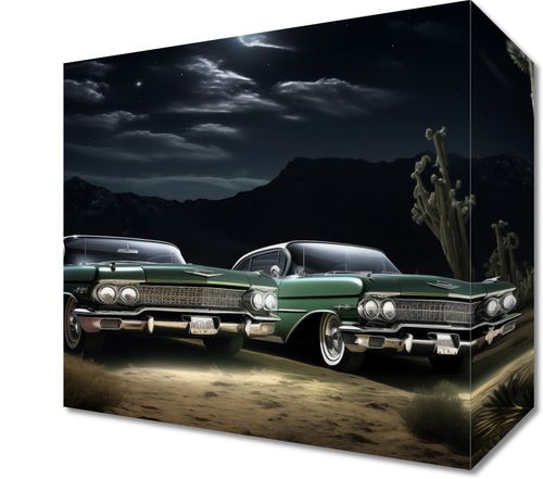 Obraz z serii wnętrza zatytułowany Nostalgiczne Spotkanie ukazuje dwa klasyczne samochody z lat 50., zaparkowane bok w bok pod rozgwieżdżonym nocnym niebem. W tle majestatyczne, ciemne góry rysują się na horyzoncie, a pomiędzy nimi a samochodami rozpościera się dzika pustynna sceneria, z charakterystycznymi kaktusami saguaro. Oświetlone przez delikatne światło księżyca, pojazdy prezentują swoje błyszczące, zadbane karoserie, które odbijają blask gwiazd. Scena ta emanuje spokojem i bezczasowością, przywołując wspomnienia podróży i przygód z minionych epok. Ten obraz doskonale odnajdzie się w przestrzeniach miłośników motoryzacji, retro kawiarniach lub jako elegancki akcent w salonach domowych, inspirując do marzeń o podróży przez historię i amerykański krajobraz.