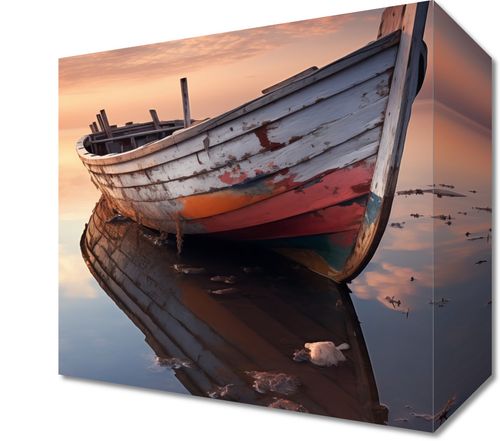 Obraz z serii pejzaże zatytułowany Odosobniona Przystań. Artystyczne zdjęcie przedstawiające opuszczoną łódź o zesztywniałych żaglach, dryfującą na spokojnych wodach przy zachodzie słońca. Odbicie łodzi w wodzie tworzy niemal doskonałe lustro, w którym łączą się niebo i morze, a zanikające kolory podkreślają upływ czasu. Złote i pastelowe odcienie zachodzącego słońca w tle nadają scenie uczucie nostalgii i spokoju. Obraz ten doskonale nadaje się do wnętrz o morskiej tematyce, takich jak nadmorskie chaty, a także jako akcent dekoracyjny w przestrzeniach, które pragną odzwierciedlić miłość do morza i żeglarstwa.