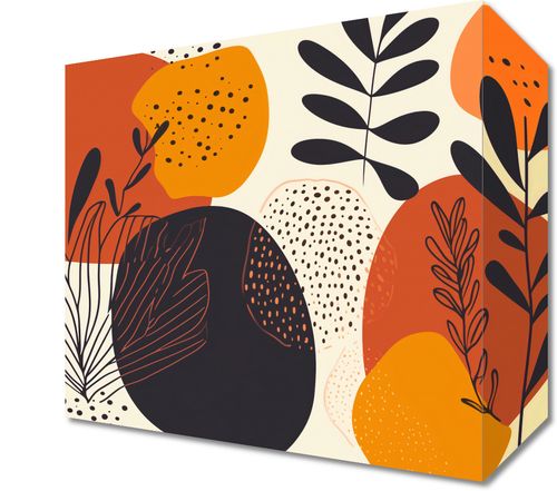 Obraz z serii minimalistyczne zatytułowany Ogród Wspomnień. Grafika ta łączy w sobie bogactwo organicznych kształtów i roślinnych motywów z paletą ciepłych barw takich jak terakota, musztarda i czerni, tworząc wizualną opowieść pełną spokoju i nostalgi.Ten obraz doskonale nada się do przestrzeni, które celebrują naturę i spokój, takich jak salony, pokoje do medytacji lub ciche zakątki bibliotek.