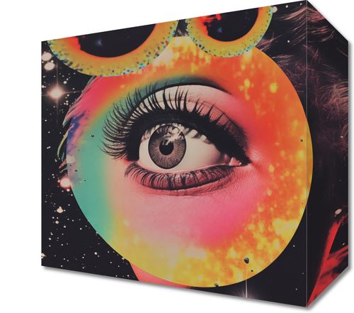 Obraz z serii pop art zatytułowany Oko w Kosmosie. Ten dynamiczny obraz to połączenie surrealistycznego portretu i kosmicznej odyseji. Centralnym punktem jest oko, które jest zarówno oknem na duszę, jak i lustrzanym odbiciem wszechświata, otoczone przez płomienne kolory galaktycznej mgławicy. Nad okiem widnieją okulary przeciwsłoneczne, w których lustrzanych szkłach odbijają się planety, nadając kompozycji głębi i zadziwiającej perspektywy. Ten obraz, pełen barw i kontrastów, to wspaniały wybór dla tych, którzy pragną dodać odrobinę kosmicznego surrealizmu do swojego wnętrza, idealnie sprawdzając się w przestrzeniach artystycznych, takich jak galerie sztuki, studia projektowe lub awangardowe salony.