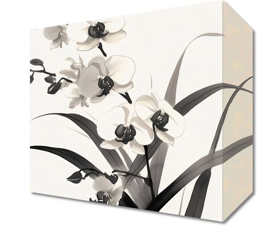 Obraz z serii wnętrza zatytułowany Orchidea. Na obraz widoczna jest stylizowana kompozycja kwiatów orchidei, przedstawiona w monochromatycznej kolorystyce. Dominują odcienie bieli i czerni, które tworzą silny kontrast, podkreślający delikatne kształty i szczegóły płatków oraz ciemniejsze środki kwiatów. Liście i łodygi są przedstawione w odcieniach szarości, co dodaje głębi i tekstury do obrazu. Całość kompozycji jest elegancka i nowoczesna, z subtelnymi gradientami i cieniowaniem dla realizmu. Tło jest jasne, co sprawia, że kwiaty wydają się jeszcze bardziej wyraziste. Ten obraz może być interpretowany jako połączenie naturalnego piękna z minimalistyczną estetyką, idealne do nowoczesnych wnętrz, które cenią sobie prostotę i elegancję.