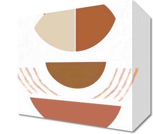 Obraz z serii boho zatytułowany Pastelowa Hipnoza. Łączy prostotę kształtów geometrycznych z subtelnością pastelowych barw, tworząc obraz o niemal hipnotycznym uporządkowaniu. W centrum kompozycji znajduje się dualistyczny kształt, który balansuje między symetrią a asymetrią, otoczony przez półkola i linie, przywołujące na myśl delikatne promienie słońca. Paleta kolorystyczna ogranicza się do ciepłych odcieni beżu, brązu i rdzawego różu, co dodaje dziełu wyrafinowanej subtelności. Doskonale odnajdzie się jako centralny punkt w jasnych, przestronnych wnętrzach, gdzie może stać się tłem dla głębokich refleksji, lub jako element dekoracyjny w minimalistycznie urządzonych pomieszczeniach, dodając im ciepła i elegancji.