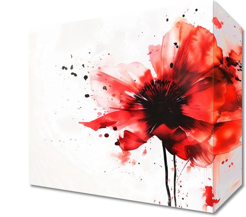 Obraz z serii abstrakcja zatytułowany Płynna Akwarela. Na obrazie przedstawiony jest kwiat w stylu akwarelowym, z dominującą czerwoną paletą barw, która przechodzi w mocne akcenty czerni w centrum kwiatu. Obraz ma dynamiczny i spontaniczny charakter, co podkreślają rozbryzgi i krople farby rozchodzące się wokół kwiatu. Przypomina to efekt plamy, który dodaje kompozycji artystycznego wyrazu i energii. Kontrast między delikatnymi czerwieniami a głęboką czerń centrum kwiatu przyciąga wzrok i czyni obraz bardzo wyrazistym. Tło jest jasne z subtelnie zaznaczonymi plamami, co dodatkowo akcentuje dramatyzm i piękno przedstawionego kwiatu.