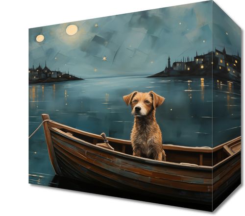 Obraz z serii wnętrza o nazwie Przygoda o Północy, ukazuje wzruszający obraz psa o przenikliwym spojrzeniu, siedzącego samotnie w łodzi na tle tajemniczego miasta. Oświetlone latarniami uliczki nadbrzeżnego miasteczka tworzą tło, które mieni się złotem i błękitem w spokojnych wodach portu, nadając scenie element magii i spokoju. Pies, o czujnym wzroku i szlachetnej postawie, jest przedstawiony z niezwykłą dbałością o detale, co sprawia, że wydaje się być bohaterem nieznanego, ale pociągającego opowiadania. Jego obecność w łodzi dodaje kompozycji głębi emocjonalnej, sugerując wierność i oczekiwanie. Plakat ten wprowadzi do każdego wnętrza element spokoju i refleksji, idealnie pasując do przestrzeni wypełnionych ciepłem i nostalgicznym urokiem, takich jak przytulne salony, kawiarnie, czy miejsca odpoczynku.