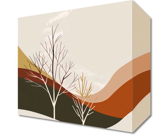 Obraz z serii minimalistyczne zatytułowany Pustynia Widzi. Obraz ukazuje dwie subtelne, ogołocone z liści drzewa, które wyłaniają się z miękkich, falujących form pustynnych wydm. Barwy są stonowane, z dominującymi odcieniami brązu, beżu i terakoty, co oddaje ciepłą i suchą atmosferę pustyni. Tło zawiera tekstury, które mogą przypominać piasek lub delikatną gęstwinę. Ten obraz doskonale sprawdzi się jako dodatek do wnętrz w stylu natur, dodając im ziemiściej palety i przywołując poczucie spokoju oraz prostoty. Będzie się dobrze komponować w przestrzeniach takich jak salon, pokój relaksu, a nawet biuro, wprowadzając elementy spokojnego krajobrazu, które mogą inspirować i uspokajać.