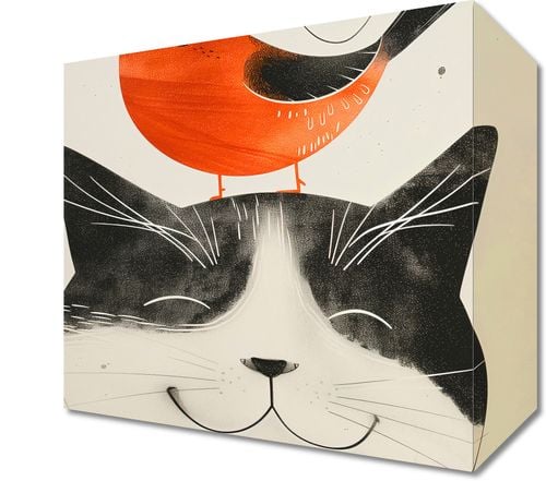 Obraz z serii abstrakcja zatytułowany Pyzaty Przyjaciel przedstawia uroczą, minimalistyczną ilustrację czarno-białego kota z zamkniętymi oczami i szerokim uśmiechem, na którego głowie spoczywa radosny, czerwony ptaszek. Kot ma charakterystyczne białe obszary wokół pyszczka, na którym wyraźnie rysują się czarne wąsy i delikatny nos. Ptaszek wydaje się być zadowolony, śpiewający, z zamkniętymi oczkami, co dodaje kompozycji wesołego i spokojnego nastroju. Tło jest jasne, z subtelnymi plamami i kropkami, które mogą imitować subtelny efekt spękanego płótna lub papieru. Po lewej stronie, na górze, widoczna jest wschodnia pieczęć, co nadaje pracy szczyptę orientalnego charakteru. Ta grafika mogłaby być idealnym, ciepłym dodatkiem do przestrzeni domowej, zwłaszcza do pokoju dziecka lub jako element dekoracyjny w przestrzeni wspólnej, przynoszący uśmiech i poczucie spokoju.