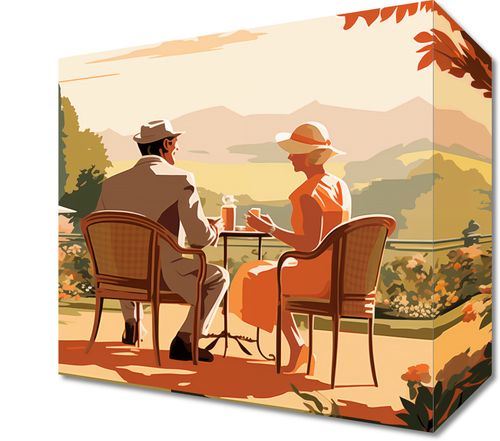 Obraz z serii abstrakcja zatytułowany Retro Randka, który przenosi nas w czasie do epoki art déco, gdzie elegancka para delektuje się popołudniową herbatą w zaciszu kwitnącego ogrodu. Ciepłe odcienie zachodzącego słońca tworzą romantyczną atmosferę, a stylizowana grafika podkreśla elegancję i wyrafinowanie epoki. Sylwetki postaci w modnych strojach tamtych lat oddają ducha minionych, beztroskich dni. Tło z rozległym widokiem na pagórkowate pejzaże i subtelnie zarysowane rośliny dodaje kompozycji głębi i spokoju. Ten obraz jest idealnym akcentem dla wnętrz inspirowanych vintage, dodając im klasy i nostalgii za światem sprzed lat.