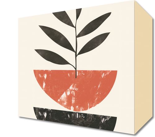 Obraz z serii boho zatytułowany Roślinna Sztuka.Ta grafika, z jej uproszczoną, ale wyrafinowaną kompozycją, prezentuje stylizowaną roślinę wyrastającą z półkolistej, czerwonej doniczki, na tle czarno-białej, teksturalnej formy. Mały, pomarańczowy kształt nad rośliną dodaje subtelnej równowagi i może symbolizować słońce albo owoc, który nadaje życie. Dzieło, z jego zredukowaną paletą barw i silnymi liniami, tworzy wyraźny, graficzny obraz. To dzieło doskonale uzupełni przestrzeń, która ceni sobie prostotę, naturę i czystą formę, idealnie nadaje się do wnętrz w stylu minimalistycznym, skandynawskim, czy współczesnym, wprowadzając element harmonii i spokojnej estetyki.