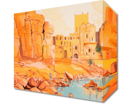 Obraz z serii abstrakcja zatytułowany Ruiny pod Słońcem. Ta ilustracja przedstawia scenę z antycznymi ruinami w ciepłej, pastelowej palecie kolorów, która oddaje odczucie spiekoty i światła słonecznego. Zarysy starożytnej architektury wyrastają z pustynnego krajobrazu, nadając scenerii poczucie wieczności i historii. Odbicie wody i subtelne sylwetki postaci w tle wprowadzają ludzki wymiar do tej scenerii, sugerując trwającą obecność i ciągłość cywilizacji. Obraz ten idealnie wprowadzi do każdego wnętrza element przygody i odkryć, inspirowany podróżami i historią, idealny dla przestrzeni publicznych, biur podróży, a także jako dekoracja w domach miłośników historii.