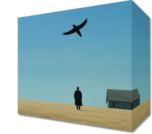 Obraz z serii abstrakcja zatytułowany Samotny i Wolny. Ten spokojny obraz prezentuje postać stojącą na rozległym polu, zwróconą w stronę małego domu i latającego wysoko ptaka. Kompozycja wyróżnia się prostotą i czystością linii, a jej ograniczona paleta barw - złocistych traw, jasnoniebieskiego nieba i ciemnych sylwetek - przyciąga uwagę i wywołuje uczucie spokoju. Obraz symbolizuje kontrast między uczuciem izolacji a pragnieniem wolności, co może być interpretowane na wiele sposobów. Idealny do przestrzeni, które cenią sobie spokój i refleksję, takich jak pokoje do medytacji, minimalistyczne salony, czy współczesne gabinety.