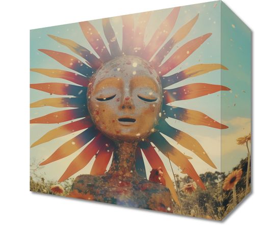 Obraz z serii pop art zatytułowany Słoneczna Medytacja. Ta inspirująca grafika przedstawia statuę medytującej postaci z aureolą w kształcie słońca, symbolizującą spokój wewnętrzny i oświecenie. Postać, zanurzona w polu kwiatów, z zamkniętymi oczami i twarzą skierowaną ku słońcu, promieniuje spokojem i harmonią. Naturalne barwy ziemi oraz promienie słońca nadają kompozycji ciepła i głębi, tworząc uczucie jedności z naturą. Ten obraz będzie doskonałym dodatkiem do przestrzeni, które cenią sobie spokój i kontemplację, takich jak salony jogi, przestrzenie do medytacji lub jako relaksujący akcent w domowych wnętrzach.