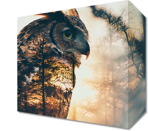 Obraz z serii natura zatytułowany Sowi Duch. Prezentuje on majestatyczną sylwetkę sowy zlewaną z tłem o zachodzie słońca w lesie, co podkreśla jej dziką naturę i instynktowną mądrość. Ciepłe odcienie zachodzącego słońca i sylwetki drzew przenikają się z delikatnym konturem sowy, tworząc wrażenie jedności z naturą. Obraz ten idealnie wpasuje się w przestrzenie takie jak gabinet, biblioteka lub salon, gdzie może inspirować do refleksji i spokoju, przypominając o głębokich, nieodkrytych aspektach natury.