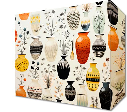 Obraz z serii wnętrza zatytułowany Symfonia Wazonów. Wspaniałe wazony w bogatej palecie kolorów, od głębokiej czerni do ciepłych odcieni pomarańczu, tworzą intrygującą mozaikę wzorów i kształtów. Delikatne motywy roślinne, które zdobią niektóre wazony, dodają uroku i lekkości, a różnorodność wzorów i faktur przyciąga wzrok i zaprasza do głębszej refleksji. Kontrast między jasnymi i ciemnymi barwami, a także subtelne niuanse w każdym wazonie, dodają tej kompozycji głębi i dramatu. Ten artystyczny plakat doskonale wpisuje się w klimat wyrafinowanych galerii sztuki, eleganckich kawiarni oraz nowoczesnych przestrzeni mieszkalnych, które stawiają na unikatowy design.
