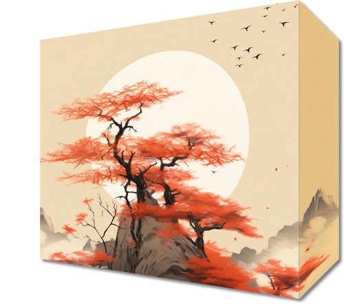Obraz z serii pejzaże zatytułowany Szepty Wiatru. Niesamowity krajobraz z jaskrawo czerwonymi drzewami rosnącymi na majestatycznej skale, której kształty wydają się być ukształtowane przez wieki. Błyszczący biały księżyc oświetla spokojne wody, które otaczają skale, podczas gdy stado ptaków przenika przez jasne niebo, dodając uczucie przestrzeni i nieskończoności. Subtelne odcienie szarości i biele w tle tworzą kontrast dla wyrazistych czerwieni drzew, nadając scenie głębię i dramatyzm. Idealny do ozdoby salonów medytacyjnych, gabinetów terapeutycznych lub luksusowych hotelowych holów.