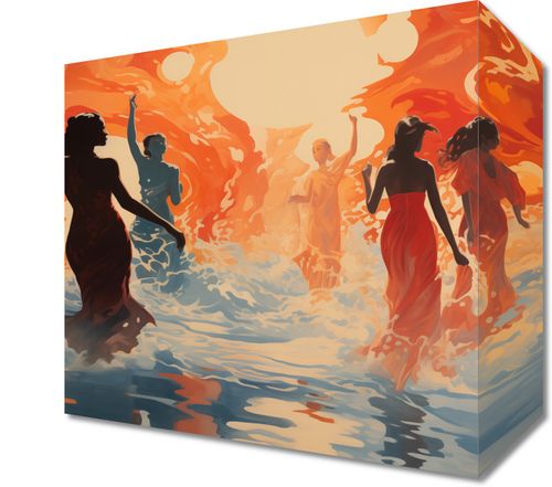 Obraz z serii wnętrza zatytułowany Taneczny Żar, przedstawia grupę osób tańczących w rytmicznych ruchach w wodzie, z tłem zapalającego się nieba w odcieniach ciepłego pomarańczu i czerwieni. Postacie są przedstawione w dynamicznych pozach, z włosami rozwianymi przez wiatr, co nadaje obrazowi wrażenie ruchu i pasji. Styl obrazu, z jego płynnymi liniami i żywymi kolorami, tworzy uczucie energii i życia. Ten obraz idealnie nadaje się do wnętrz, które chcą uchwycić esencję ruchu, radości i wolności, takich jak studia taneczne, kreatywne przestrzenie pracy, a także jako inspirujący element w domach, gdzie może stanowić przypomnienie o pięknie wspólnych chwil i celebracji życia.