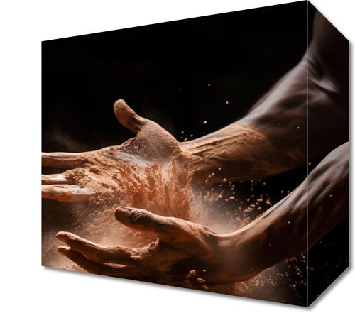 Obraz z serii wnętrza zatytułowany Taniec Ziemi. Dramatyczne zdjęcie rąk artysty, które rzucają w powietrze obłoki brunatnego pyłu, przypominającego ziemię, przeciwko głęboko czarnemu tłu. Dynamiczne ruchy, uchwycone w jednej chwili, emanują siłą i pasją, a ekspresja ciała dodaje obrazowi życia i energii. Ten plakat pasuje do przestrzeni współczesnych i kreatywnych, takich jak studia artystyczne, sale taneczne, czy też jako wyrazisty akcent w nowoczesnych biurach. Z pewnością zainteresuje osoby ceniące sztukę, ruch i ekspresję.