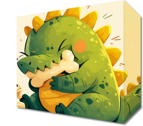 Obraz z serii wnętrza zatytułowany Uroczy Dinozaur. Przedstawia zabawną i uroczą ilustrację zielonego, kreskówkowego dinozaura, który wygląda na szczęśliwego i beztroskiego. Dinozaur ma duże, wyraziste oczy i szeroki uśmiech, a jego skóra pokryta jest jasnymi plamami i kropkami. Z wyglądu przypomina przyjaznego Tyranozaura. Jego małe ręce tulą kość, co może sugerować, że cieszy się z posiłku. Jego ogon i grzbiet zdobią charakterystyczne żółte kolce, które dodają mu komicznego charakteru. Tło jest jasne i neutralne, co sprawia, że postać dinozaura jest głównym punktem zainteresowania. Obraz sprawia wrażenie ciepłego i przyjaznego, idealnego do dekoracji pokoju dziecięcego lub jako element dodający humoru i radości do każdej przestrzeni.