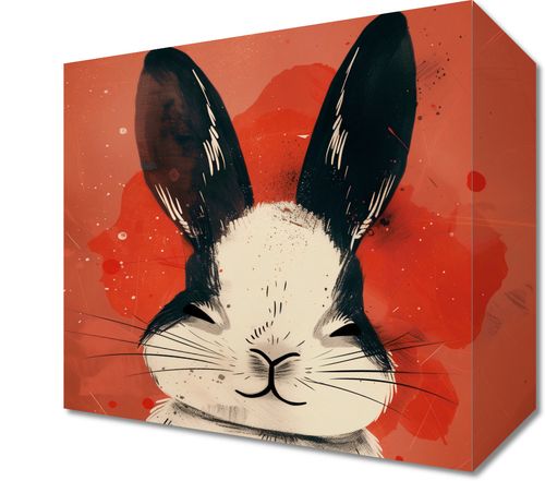 Obraz z serii abstrakcja zatytułowany Uśmiech! przedstawia wizerunek królika w stylistyce inspirowanej street art'em. Tło w ciepłej, czerwonej kolorystyce jest pokryte energicznymi plamami i rozpryskami farby, nadając dynamizmu całości kompozycji. Królik jest przedstawiony frontowo, z głową skierowaną prosto na widza. Jego uszy są wyraziste, czarne z białymi akcentami, co daje efekt trójwymiarowości. Urocza twarz zwierzęcia z subtelnym uśmiechem i charakterystycznymi wąsami wydaje się emanować spokojem i ciepłem. Detale takie jak tekstura futra królika są zaznaczone delikatnymi liniami i cieniowaniem, co dodaje realizmu i głębi grafice. Obraz ten sprawdziłby się jako dekoracja w przestrzeniach współczesnych, które cenią sobie oryginalność i lekkość wizualną, a jednocześnie wprowadza przytulny, domowy nastrój.