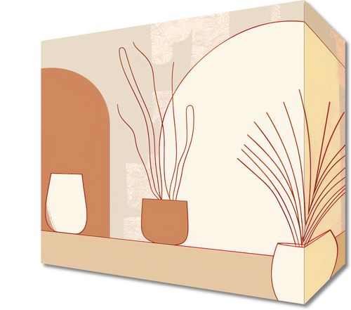 Obraz z serii boho zatytułowany Widok Roślin. Obraz przedstawia trzy stylizowane donice z roślinami, umieszczone na półce w harmonijnym ułożeniu, na tle geometrycznych kształtów w ciepłych, pastelowych kolorach. Proste linie i spokojne barwy tworzą atmosferę relaksu i spokoju, a subtelne tekstury dodają głębi i zainteresowania.Świetnie sprawdzi się w wnętrzach, które cenią sobie spokój i naturalne elementy, takich jak jasne salony, przytulne sypialnie lub miejsca wypoczynku. Jest to idealny wybór dla miłośników minimalizmu i skandynawskiej estetyki.